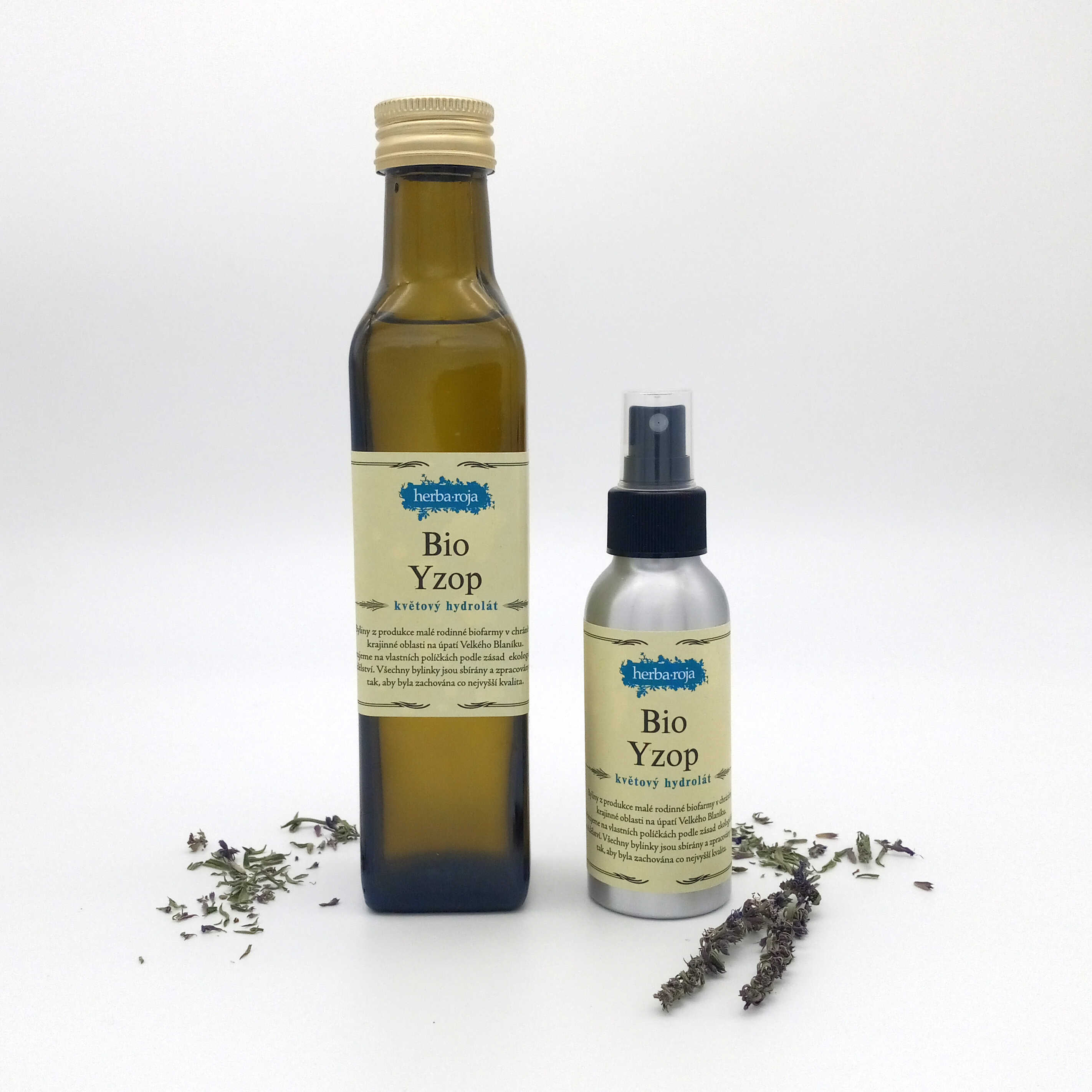 Květová voda z ručně sbíraného yzopu lékařského vzniká několikahodinovou destilací bez chemických konzervantů. Obsahuje éterické oleje, má osvěžující překvapivou vůni, která přináší energii. Blahodárně působí na záněty krku, proto hydrolát můžete využít i jako kloktadlo.