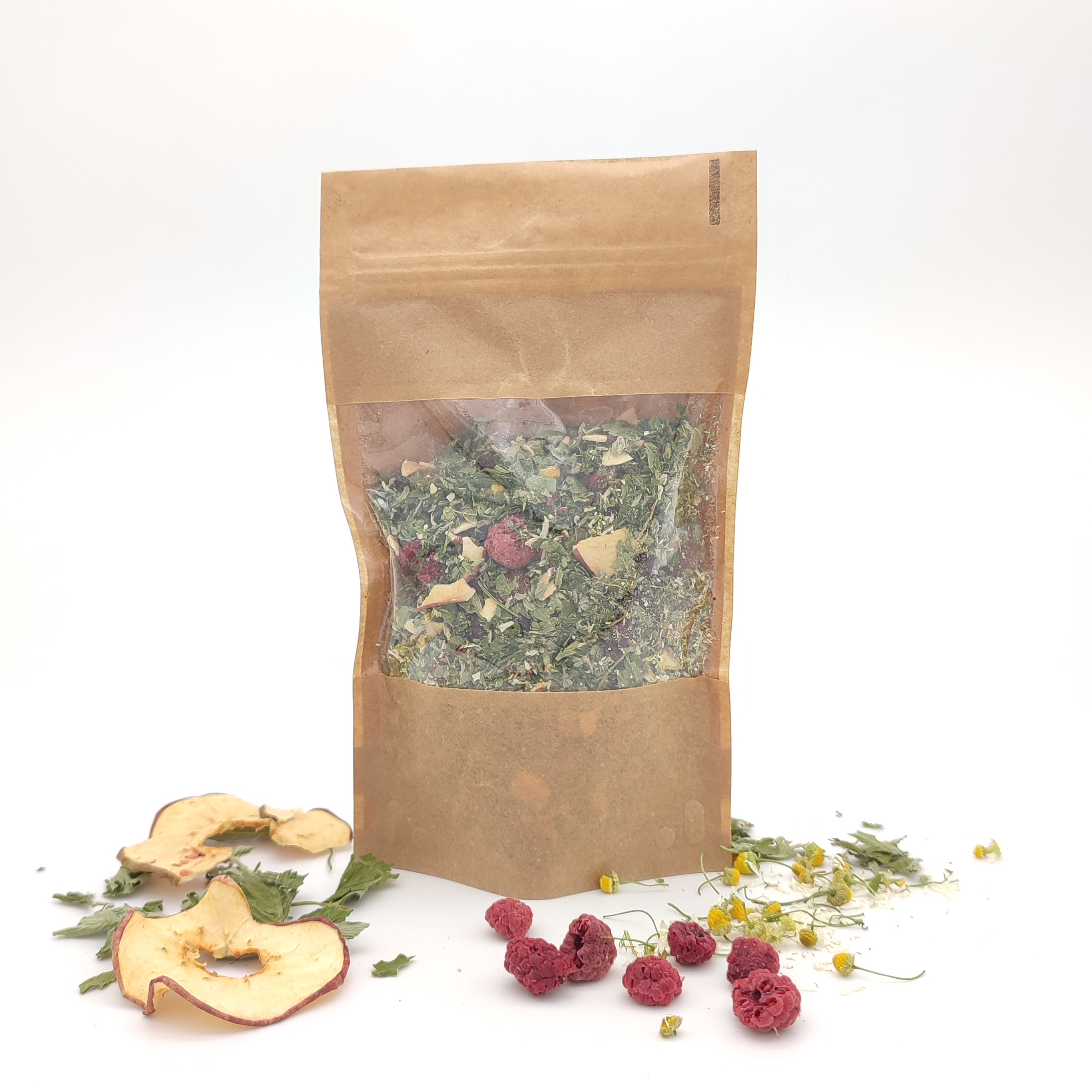 Obsah bylin v balení v g: červený rybíz BIO 7,11, malina plod BIO 5,39, jablíčko sušené 4,85 2,48, malina list BIO, jahodník BIO 1,72, heřmánek BIO 1,72, meduňka BIO 1,72