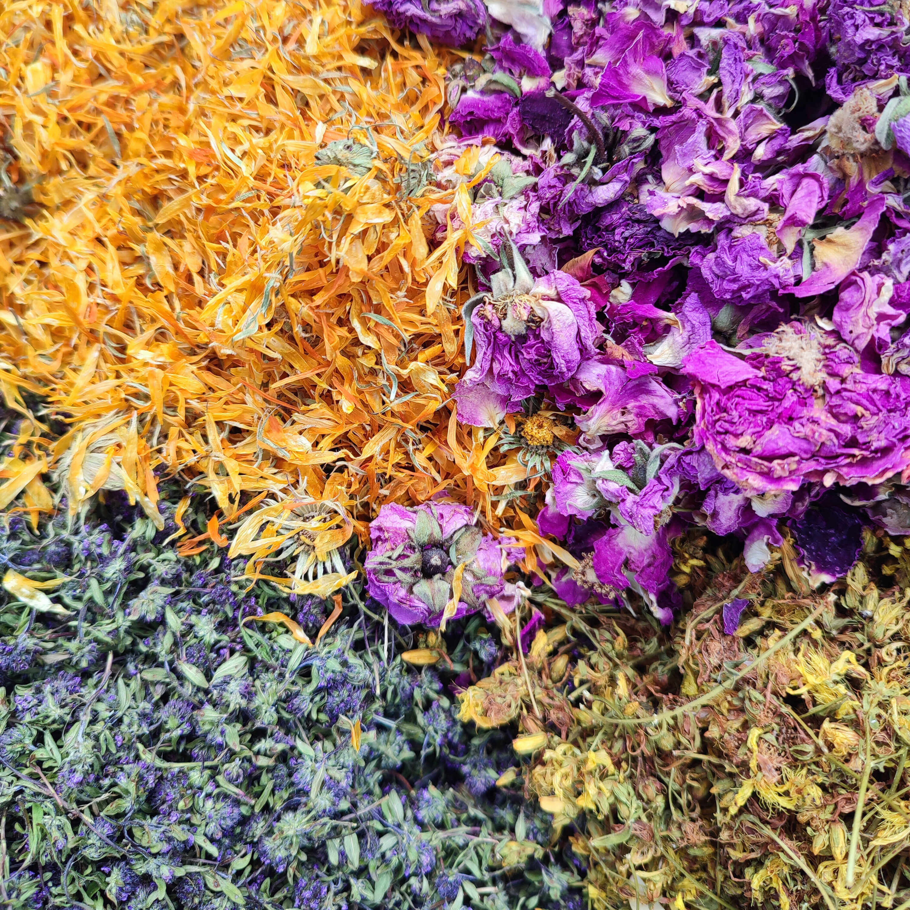 Bio dobromysl obecná, bio mateřídouška úzkolistá, bio třezalka tečkovaná, bio levandule lékařská, bio růže stolistá, bio měsíček lékařský, bio šalvěj lékařská