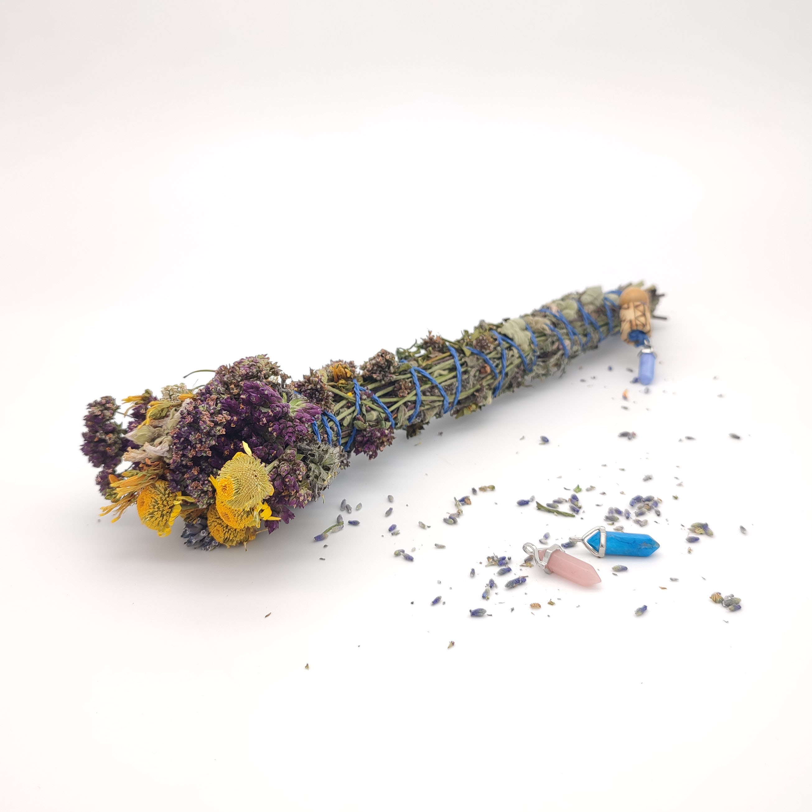 Vykuřovací svazky jsou ručně vyrobené z pečlivě vybraných bylin vhodných pro vykuřování. Každý kus je originální kombinací bylin z našich polí a luk. Provoní, ale také ochrání váš domov a je krásnou přírodní dekorací. Každý svazek je individuálně zpracován a ozdoben do dokonalé harmonie kyvadlem s ochranným kamenem, který jeho sílu ještě více podpoří.